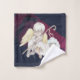 Bathroom towel set designed with a sweet angel with yellow wings holding a shepherds crook. Sitting with white fluffy lambs. Navy blue and burgundy watercolor background, with tiny flecks of faux gold sparkle glitter (not actual glitter just a printed image).