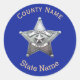 This custom round sticker is decorated with a Sheriff Deputy Badge and can be customised above with the name of a town or city and below with the State name, or any other information you would care to substitute.
