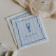 Our summery lobster bridal shower napkins are perfect for your seaside celebration! Whimsical coastal design features summery Mediterranean blue lettering and illustrations on a pale blue cabana stripe background. A hand drawn lobster doodle sits atop two lines of custom text, all framed by a wavy scallop doodle border. Shown with "she's a catch" and the bride to be's name.