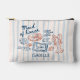 The accessory pouch features a whimsical handwritten font that adds a personal and playful touch. Adorning the design are charming hand-drawn illustrations of seafood, including a lobster, shrimps, and oysters. These delightful sketches create a lively and vibrant atmosphere, perfectly complementing the seaside theme. The design features a nostalgic blue and red colour palette, evoking the classic charm of vintage seaside postcards. This retro colour scheme adds a touch of fun and elegance, making it a standout piece.