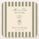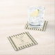 Birthday paper coaster featuring a hand-drawn coffee martini glass and coffee beans paired with elegant script and serif fonts in which your personalized information is written. The background is sage green stripes on a light background. Check out our store for more items from this collection.
