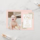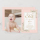 A cute 1st birthday celebration photo invitation featuring the birthday girl's special photo, watercolor greenery leaves on a pink background, and elegant gold typography. Designed by Thisisnotme©