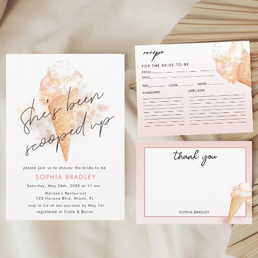 She's been scooped up! This elegant collection of Bridal Shower stationary features a watercolor ice cream design. It is accented by a modern script and blush pink. Modern gold splashes and ice cream are sure to wow the bride!