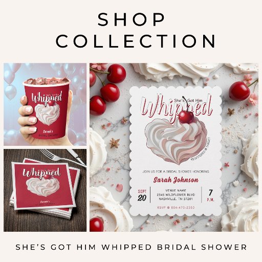 Be fun and flirty with these She's Got Him Whipped bridal shower napkins. With bold red hues and a yummy, whipped cream heart and cherry on top, these napkins sets a spicy, yet romantic vibe to celebrate the soon to be bride. Personalise the details to make it uniquely yours.