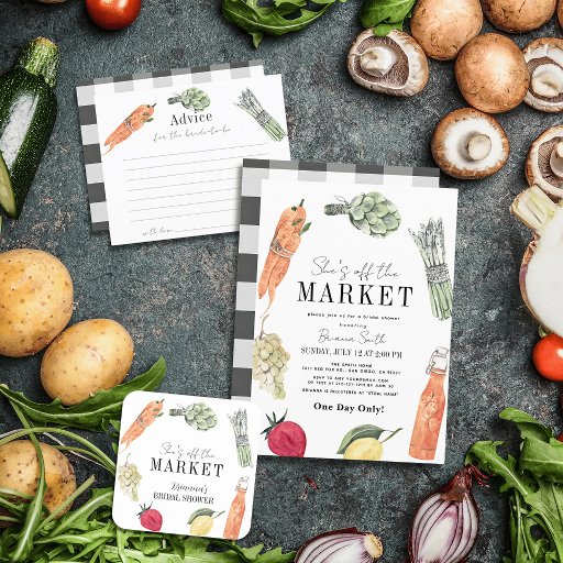 This cute "She's off the market" farmer's market bridal shower paper napkin features a white background with vegetables and fruits in watercolor. Personalise for your needs. You can find matching products at my store.