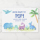 Cute Brachiosaurus, Stegosaurus, Pterodactyls, Dinosaurs that have Tropical Greenery Botanical Watercolor of green and blues She's Ready To Pop mini sparkling wine labels- includes beautiful and elegant blue script typography with modern tropical palm trees and greenery are a perfect favour gift for the special Mother to Be celebration.