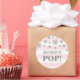 Baby Shower She's Ready to POP favour tag stickers in light blush pink and white stripes pattern with silver snowflakes, perfect for a winter or Christmas baby shower.