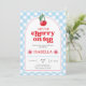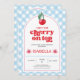 Celebrate your sweetest little arrival with this charming "Cherry on Top" baby shower invitation! Featuring a whimsical cherry theme, retro-inspired typography, and a soft blue gingham border, this delightful invite sets the perfect tone for a joyful celebration.