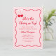 Celebrate a lucky in love bachelorette party with a fun, flirty vegas bachelorette party vibe! This invitation features a red and pink bachelorette party theme, perfect for a drunk in love bachelorette celebration. With kiss the miss goodbye and cherry on top bachelorette touches, it’s ideal for a perfect match bachelorette theme or even a valentines bachelorette party. Add a personal twist to this drunk in love send-off!