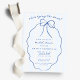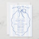 Stylish Blue and White Hand Drawn Doodle Bow Bridal Shower Invitation with a hand drawn wavy oval ribbon frame topped with a bow. The editable headline "she's tying the knot" is in blue handwritten style font on a blue and white striped background.