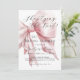 Simple and beautifully feminine, this bridal shower invitation exudes elegance showcasing a large luxurious pastel pink watercolor bow as its centerpiece. The bow is angled and slightly off-centre, appearing soft and flowing with delicate shadows giving a 3-D effect. It stretches gracefully across the invitation symbolising the act of "tying the knot." The plain white background adds a style of simplicity and sophistication. A font pairing of modern handwritten script and elegant serif presents your text beautifully. Simply personalise the template with your event details.