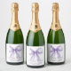Elegant sparkling wine bottle labels for your bridal shower featuring a purple coquette bow watercolor, "she's tying the knot" showcased in a chic script, and the bride's name and the shower date in simple lettering.