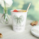 Elegant paper cupps for her bridal shower that feature a sage green bow watercolor, "she's tying the knot" in a chic calligraphy script, and the bride's name and the shower date in simple modern lettering.
