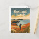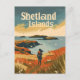 A picturesque vintage depiction of the Shetland Islands, Scotland, showcasing their rugged coastal landscapes, ancient ruins, and vibrant cultural heritage. The design features the islands' dramatic cliffs, expansive seascapes, and traditional croft houses, all rendered in a nostalgic style. This artwork captures the timeless allure and natural beauty of the Shetland Islands, inviting viewers to explore their remote charm and rich maritime history.