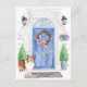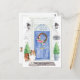Announce your new address with our stylish announcement featuring a Shetland Sheepdog, blue front door, welcome mat, slate sign, topiaries and a floral wreath set on a grey brick background.