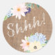 a pretty sticker with the word "Shhh!" outlined in lace effect on a burlap look background. The design is available in the large and small circles perfect for a envelope seals for surprise party invites (will match my Burlap / Lace surprise party invitations).