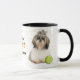 "Shih-Tzu kisses fix everything" declares this mug for the Shih-Tzu Dog owner. The image on each side is a portrait of an adorable Shih-Tzu with a green tennis ball. The images and text are placed on a white background that is sprinkled with gold confetti.