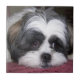 A Cute white and black Shih Tzu dog laying down on a rose / pink blanket. Adorable Shih Tzu Dog Breed Photograph image prints.