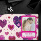 Personalize your workspace with this custom desk mat, featuring a romantic couple’s photo framed by shimmering purple hearts and the sweet caption, "You're the one I text back immediately". Perfect for work, gaming, or home office setups.