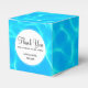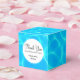 Party favour box (tiny size - 2 inch by 2 inch) with a photograph of clear blue pool water, with shimmering reflections. A white circle layered over top with your text inside.