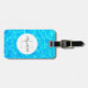Personalised luggage tag with a photograph of clear blue pool water, with shimmering reflections. A white circle layered over top with your name and initial inside.