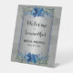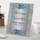 Add a touch of glamour to your bridal shower celebration with our Shimmering Silver Welcome Pedestal sign, featuring enchanting blue florals set against a backdrop of sparkling silver.