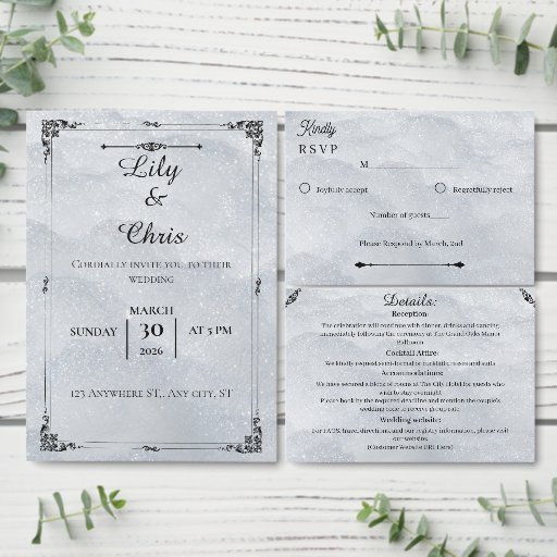 This elegant RSVP card features a high-definition background that mimics the ethereal, shimmering glow of fresh snow. The clean, borderless design highlights the luxurious winter texture while providing a clear and sophisticated layout for your guests' responses. With bold, modern typography and a simple decorative divider at the bottom, it ensures a coordinated and high-end look for your wedding suite.