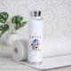 The bottle looks even better in real life. The ice cubes I put in lasts all day! I have my bottle with me all the time. It's summer and having something cold to drink feels amazing. With this bottle I always have something super cold. I have only tried the hot drink once and it lasted a long time as well. The color blue is a navy blue and the white printed on it is vibrant. It printed perfectly. I love my personalized smile water bottle.