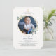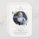 A religious invitation with a multi-angle gold frame embellished with blue-green foliage. The cross can be dragged to any location, made larger or smaller ( + - ), or eliminated. (<a href="https://www.freepik.com/free-photos-vectors/flower">Flower vector created by BiZkettE1 - www.freepik.com</a>). The card is easy to customise with your wording, font, font colour and choice of six paper types.<br/><br/>Not exactly what you're looking for? All our products can be custom designed to meet your needs at no extra charge.<br/><br/>Simply contact us at askcottonlamb@gmail.com<br/><br/>Coordinating products available:
