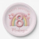 A custom birthday party plate for an 8 year old girl featuring cute rainbow theme on a soft pink background. An image of a 3D balloon style, pastel pink number "8" is placed over a cute chubby and shiny rainbow. Cute little hearts accent the area. A sample "HAPPY BIRTHDAY" greeting is printed above, with a sample name printed below. You can personalize the plate to include your own custom name or other text.