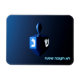 A modernistic, metallic blue dreidel against a dark, night-like background. Two of the Hebrew letters found on a dreidel, nun and shin, glow brightly. Hebrew text reading "Chag Chanukkah Sameach" (Happy Hanukkah) also appears in glowing blue and white.