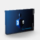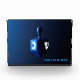 A modernistic, metallic, blue dreidel against a dark, night-like background. Two of the Hebrew letters found on a dreidel, nun and shin, glow brightly. Add your own text.