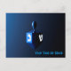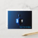 A modernistic, metallic blue dreidel against a dark, night-like background. Two of the Hebrew letters found on a dreidel, nun and shin, glow brightly. Add your own text.