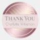 These glamourous stickers feature a blush coloured or dark pink background that has a shiny, metallic-like effect with the gradient design of the colour. The lighter shade near the centre give a reflective or shiny look. The sticker is framed with a circular white gold glitter design border. A shiny looking gold, tropical palm leaf is printed across the sticker with a personalised label printed over it. The rectangular text area features a soft pink background colour with the phrase "Thank You" printed above a sample name. You can personalise the sticker and add your own name, business name, or custom message or quote.