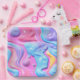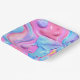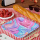 Colourful shiny pink, blue, purple and yellow plastic swirled abstract design with bubbles