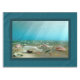 A ship in a bottle sunk in the shallows of the ocean, surrounded by seashells and lit by rays of sunlight.