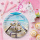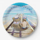 Cute little sailor baby boy and teddy bear sitting on the beach in their sailor gear. Perfect paper plates for a nautical themed baby shower.