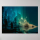 Traditional sailing ships on a northern coastline under the Northern Lights (Aurora Borealis) at night. Generative art inspired by North American and Scandinavian landscapes.