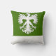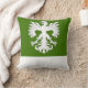 "Vert, an eagle displayed, wings inverted and a base argent" Populace badge for the Shire of Adlersruhe in the Society for Creative Anachronism. Back of pillow is a mediaeval-style pattern in coordinating colours.