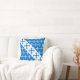 "Azure crusilly flory, on a bend argent five crosses flory azure." Populace badge for the Shire of Nahrun Kabirun (SCA). Back of pillow is a mediaeval pattern in coordinating colours.