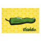 A green shishito chilli pepper, also known as kkwari-gochu in Korean, is decorated with patterns inspired by Korean designs and sits on a yellow background with a smaller version of the same pattern and a script label in the corner. This mild pepper is eaten throughout Korea and Japan both raw and cooked.