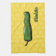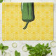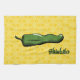 A green shishito chilli pepper, also known as kkwari-gochu in Korean, is decorated with patterns inspired by Korean designs and sits on a yellow background with a smaller version of the same pattern and a script label in the corner. This mild pepper is eaten throughout Korea and Japan both raw and cooked.