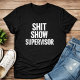 Step into your leadership role—no matter how chaotic things get—with this bold and hilarious “ShitShow Supervisor” shirt. Perfect for those who keep everything (barely) together when life, work, or the group chat turns into total madness.