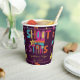 Make your graduate feel like a star with personalised graduation party supplies. These paper cups feature the slogan SHOOT FOR THE STARS in brightly coloured painted style lettering against a dark purple background with your own custom congratulations message and class of year in yellow script style lettering. The rest of the cup has a pattern of colourful stars against a purple background.