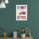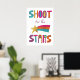 Fun painted style lettering spells out the message SHOOT FOR THE STARS in blue, yellow, lavender, orange and pink lettering against a plain white background along with a matching shooting star graphic.