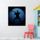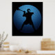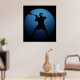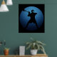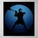 Lacrosse Shooter. Locked, cocked and ready to rock. Silhouette of lacrosse player holding stick, in the midst of firing a shot on goal. Circular emblem design in blues with emanating rays. Lacrosse poster print . Black background version.