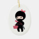 Cute cartoon ninja girl dressed in black but for a pink bow on top of her head mask. Traditional Japanese katana sword can be seen strapped to her back, it’s handle also coloured pink. The girl is holding a pink shopping basket.