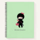 Cute cartoon ninja girl dressed in black but for a pink bow on top of her head mask. Traditional Japanese katana sword can be seen strapped to her back, it’s handle also coloured pink. The girl is holding a pink shopping basket.