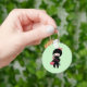 Cute cartoon ninja girl dressed in black but for a pink bow on top of her head mask. Traditional Japanese katana sword can be seen strapped to her back, it’s handle also coloured pink. The girl is holding a pink shopping basket.