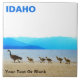 Cute Canada Geese (Branta canadensis) goslings are escorted along the shoreline of Lake Pend Oreille in northern Idaho by an adult. Customisable text reading "IDAHO" also appears. Customise further by adding your own additional text. This is a typical scene at City Beach park in Sandpoint.